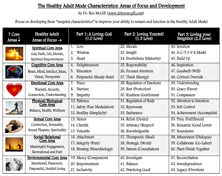 This section of the book was the original inspiration for writing it, as I asked myself: “If I were to provide, a core set of “best practices” for people to develop for their well-being and for the well -being of others, what would they be? What would be on the list of “best practices” that, when applied consistently, would lead to wise behaviors and life-giving outcomes for the rest of their life? So here it is, the “63 Healthy Adult Mode Behaviors!” – Dr. Ken McGill