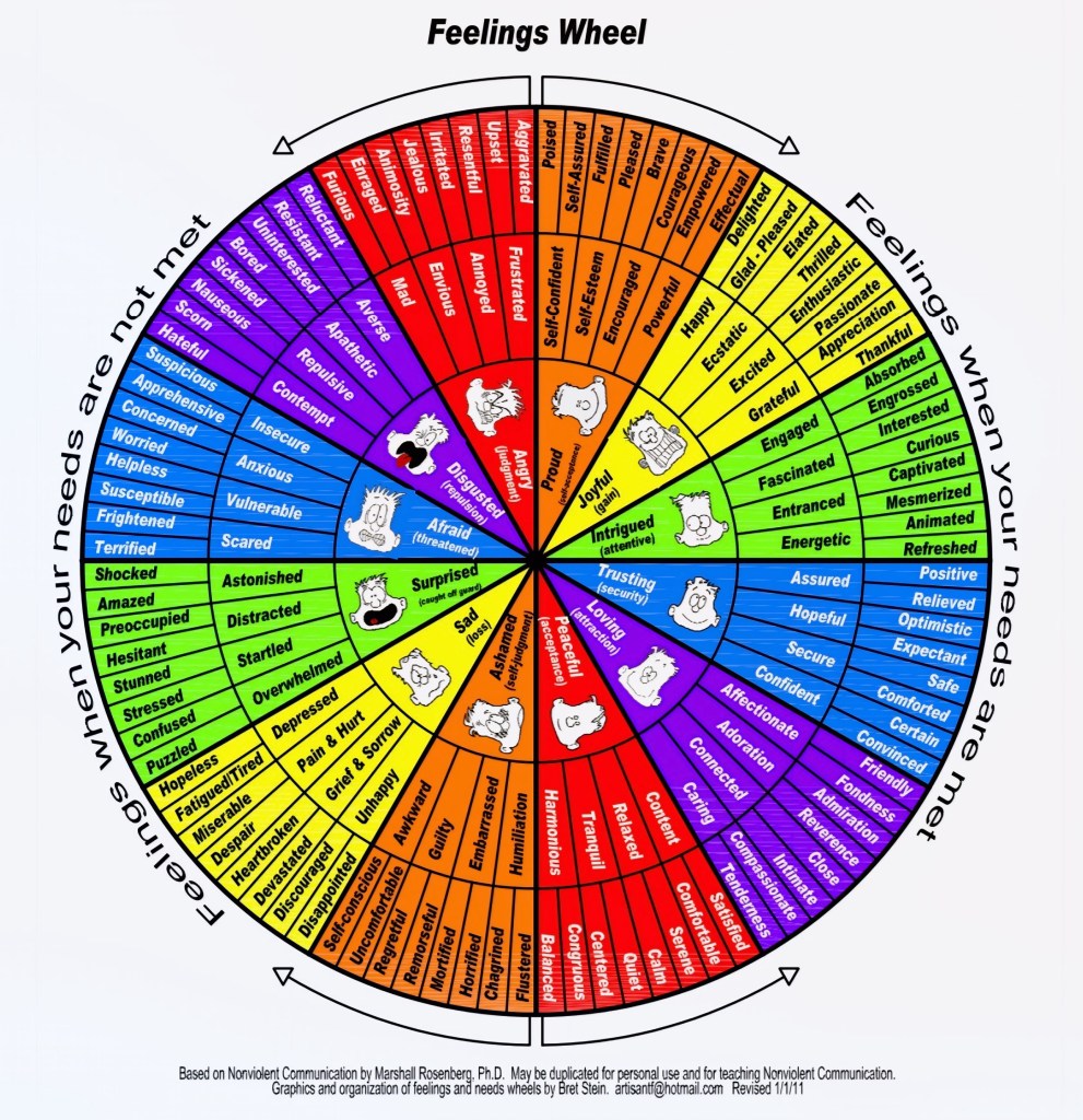 Which emotions or feelings on the Feelings Wheel would you like to experience more often? Remember, sharing your thoughts, making intentional choices, meeting needs, and working toward “win-win” relationship outcomes strongly influence how you feel.