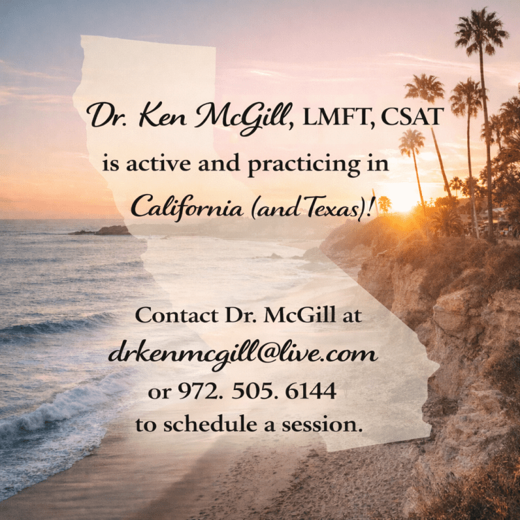 Ken is also a Licensed Marriage and Family Therapist in the States of Texas, California and MIssissippi, and is a Certified Sex Addiction Therapist, through the International Institute for Trauma and Addiction Professionals (IITAP). Ken is currently studying to pass the “final hurdle” in his effort to obtain his Clinical Psychologist license.